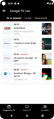 SenegalTV Live tarjoaa päivittäisen oppaan laajaan valikoimaan paikallisia TV-kanavia, kuten RTS1, RTS2, WALF TV ja TFM. Lisäksi se esittelee kansainvälisten kanavien, kuten Novelas TV, Nollywood TV ja ZEE Magic, ohjelmatarjontaa.