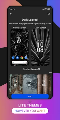 Astu personoinnin maailmaan tämän ainutlaatuisen teemasovelluksen avulla, joka on suunniteltu tuomaan eloa laitteesi ulkoasuun. Se opastaa sinut sujuvasti viralliseen teemakauppaan, missä voit valita ja aktivoida upeita teemoja ja taustakuvia laitteellesi – kaikki vaivattomasti ja ilman lisäkustannuksia. Löydä inspiraatiota laajasta valikoimasta, joka on huolella koottu ilahduttamaan visuaalista silmää ja muokkaamaan puhelimesi ilmettä juuri sellaiseksi kuin haluat.