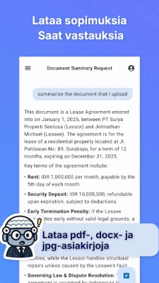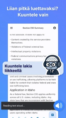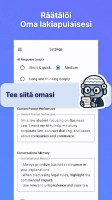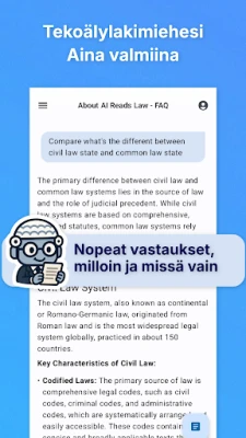 "AI lukee lakia Oikeusavustaja" on tekoälypohjainen juridinen chatbot ja henkilökohtainen tutkimusavustajasi. Se tarjoaa välittömiä vastauksia lainsäädäntöön, oikeuskäytäntöön ja termeihin 24/7. Kysy juridisia kysymyksiä tai kuuntele tietoa tekstistä puheeksi -toiminnolla. Älykäs digitaalinen neuvonantajasi.