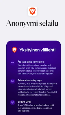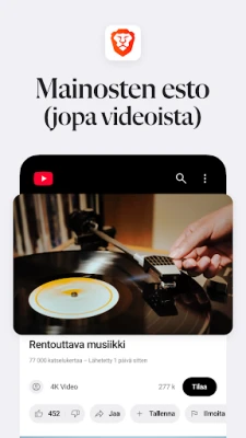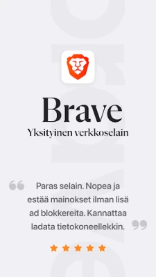 Brave Nettiselain on yksityinen ja turvallinen selain, joka estää kolmannen osapuolen mainokset. Se on ilmainen ja jo yli 100 miljoonaa käyttäjää luottaa siihen. Sisältää tekoälyavustajan Brave Leon, palomuurin + VPN:n sekä tehokkaan mainosteneston.