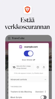 Brave Nettiselain erottuu sisäänrakennetun mainosten estäjänsä (AdBlocker) ansiosta, joka eliminoi kolmannen osapuolen mainokset ja seuraimet tehokkaasti. Tämä ei ainoastaan takaa puhtaampaa näkymää, vaan myös merkittävästi parantaa selausnopeutta ja pidentää laitteesi akun kestoa säästämällä mobiilidataa. Yksityisyytesi on Brave-tiimin ensisijainen prioriteetti. Sovellus on vahvistettu johtavilla tietosuojaominaisuuksilla, kuten automaattisella HTTPS Everywhere -salauksella, komentosarjojen estolla ja kolmannen osapuolen evästeiden torjunnalla, varmistaen, että verkkotoimintasi pysyy omana asianasi.