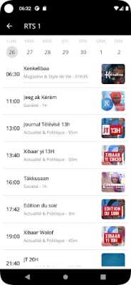 SenegalTV Live tarjoaa päivittäisen oppaan laajaan valikoimaan paikallisia TV-kanavia, kuten RTS1, RTS2, WALF TV ja TFM. Lisäksi se esittelee kansainvälisten kanavien, kuten Novelas TV, Nollywood TV ja ZEE Magic, ohjelmatarjontaa.